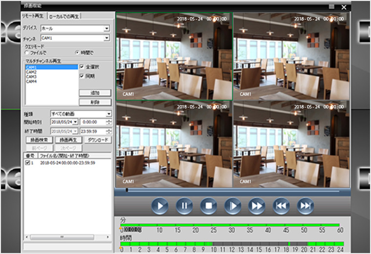 カメラを展開し、録画再生をクリックします。デバイス・チャンネルを選択し、クエリモードで時間でにチェックを入れます。1チャンネルづつ再生する場合は追加をクリック、全てのチャンネル(最大4ch)を再生する場合は全選択・同期にチェックを入れ、種類を選択し、開始時刻を設定して録画検索をクリックします。ファイル名が表示されたら番号にチェックを入れ、録画再生をクリックします。