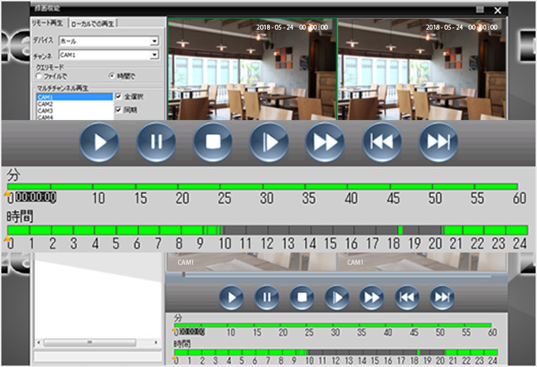 左から順に再生・一時停止・停止・スロー再生・早送り。右の2つは使用しません。時間のマスをクリックすると、その時間帯の映像を再生します。録画データのある時間帯のマスは、緑で表示されます。