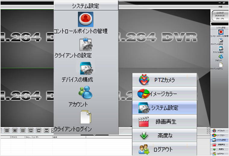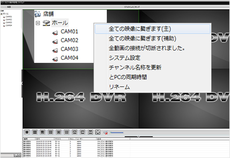 デバイスをダブルクリックすると、レコーダーのチャンネル数に応じてカメラが展開されます。展開後、デバイスを右クリックすると、動作設定等を選択できるので、全ての映像に繋ぎます(主)をクリックします。