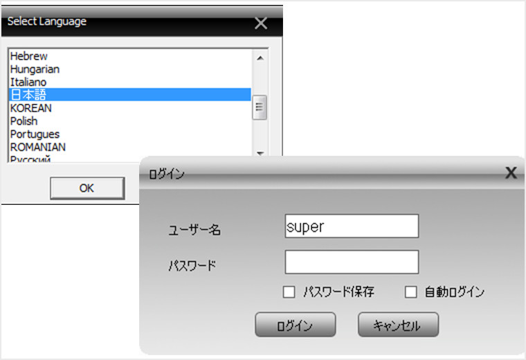 CMS初起動時に言語を選択することができます。初期設定は「ユーザー名:super、パスワード:なし」となっており、そのままログインをクリックします。